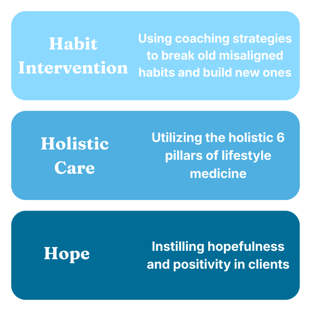 My one-on-one coaching programs, workshops and retreats are rooted in the pillars of lifestyle medicine and my proprietary 3-H Coaching Approach.